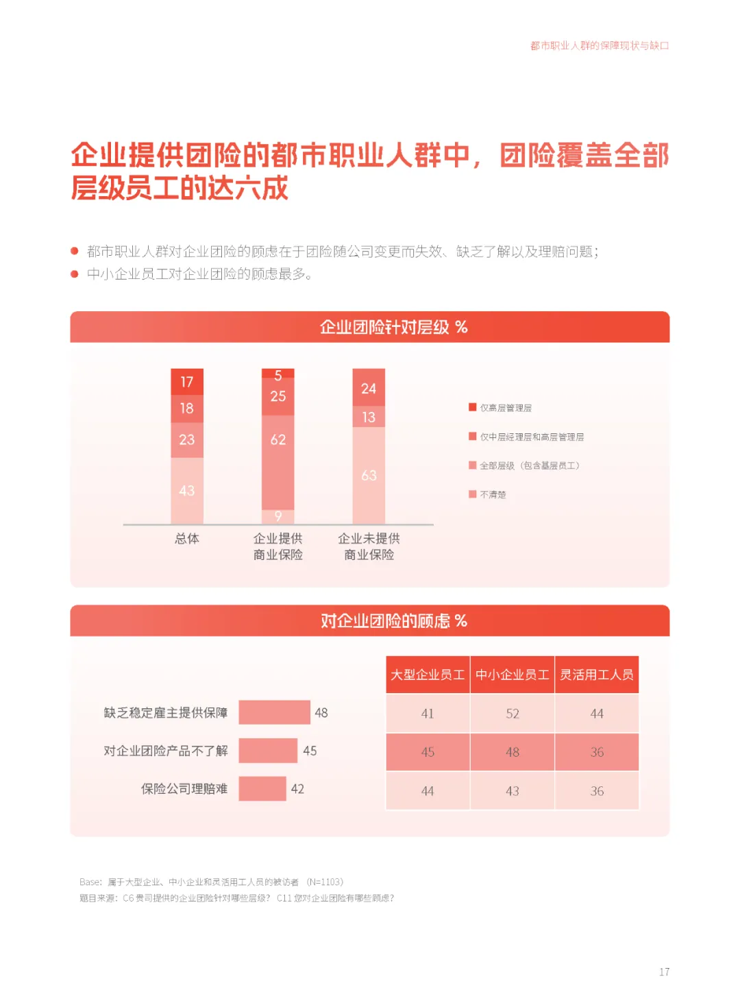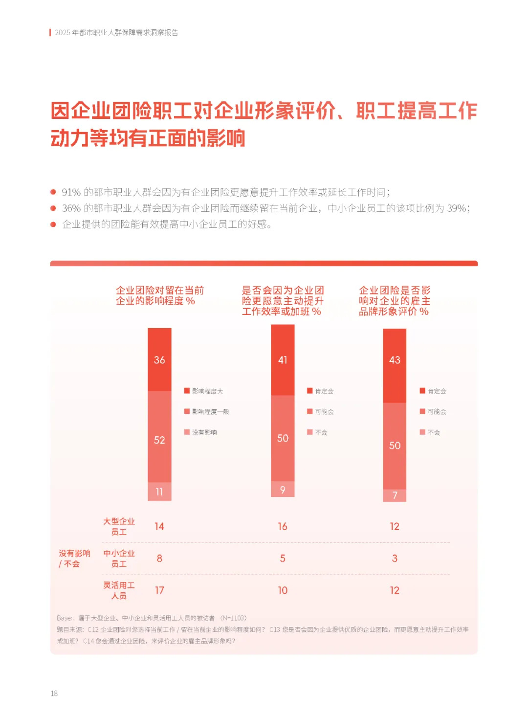 报告显示,91%的都市职业人群认为企业团险能激发工作积极性,36%的人表示它会直接影响去留选择。对于中小企业而言,提供符合员工需求的团险计划,不仅能够有效提升雇主品牌形象,还能在“稳员工、促发展”方面发挥关键作用。然而,当前企业团险供需存在不平衡,现有团险组合以“意外险+补充医疗+补充养老”为主,而员工更希望增加重疾险等保障内容。这为保险机构提供了产品创新与服务优化的方向。
