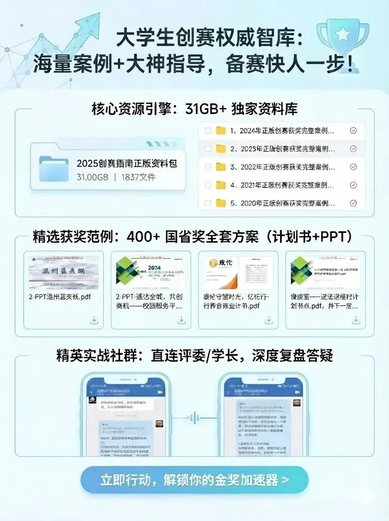 国奖案例库:近 5 年超 400 份国奖案例,覆盖中国国际 “互联网 +”、三创赛、大创等赛事,精准学习获奖项目思路与文本范式,稳拿创赛!