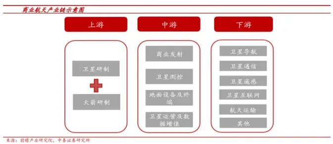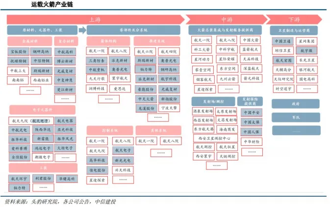 运载火箭产业链的上游为原材料、元器件、工装以及加工得到的零部件、分系统;中游为火箭总装集成与发射服务提供商以及配套的发射场 / 测控单位和发射保险提供商;下游为卫星制造与运营商以及政府、军队等客户。