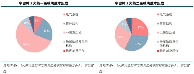 分系统主要包括箭体结构、推进系统、控制系统和其他系统,其中推进系统技术复杂,研制壁垒最高。箭体结构包括整流罩、主承力架等,承载火箭各系统仪器设备并连接成整体,承受各类载荷;推进系统包括主动力系统、辅助动力系统及增压输送系统,是火箭动力来源,对性能起决定性作用;一级火箭发动机成本占比高,二级火箭的发动机、箭体结构和电气系统成本接近。