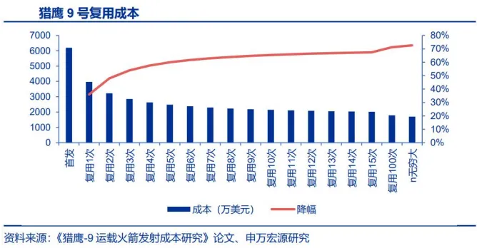 据《猎鹰-9运载火箭发射成本研究》论文数据,保守估计,可复用10次情况下猎鹰9号单次发射的平均成本可降低至2145万美元,仅一子级回收多次重复使用即可降低发射成本的65.4%。其合同价约为6200万美元,整流罩、推进剂等相关成本约500万美元,二子级制造成本约1240万美元;截至2025 年10月,猎鹰9号已实现一子级最高重复使用31次、一子级累计回收超400 次的纪录。