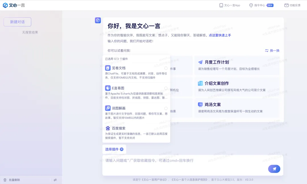 (目前文心一言支持百度搜索、图表生成、文档摘要、图片解说等插件)