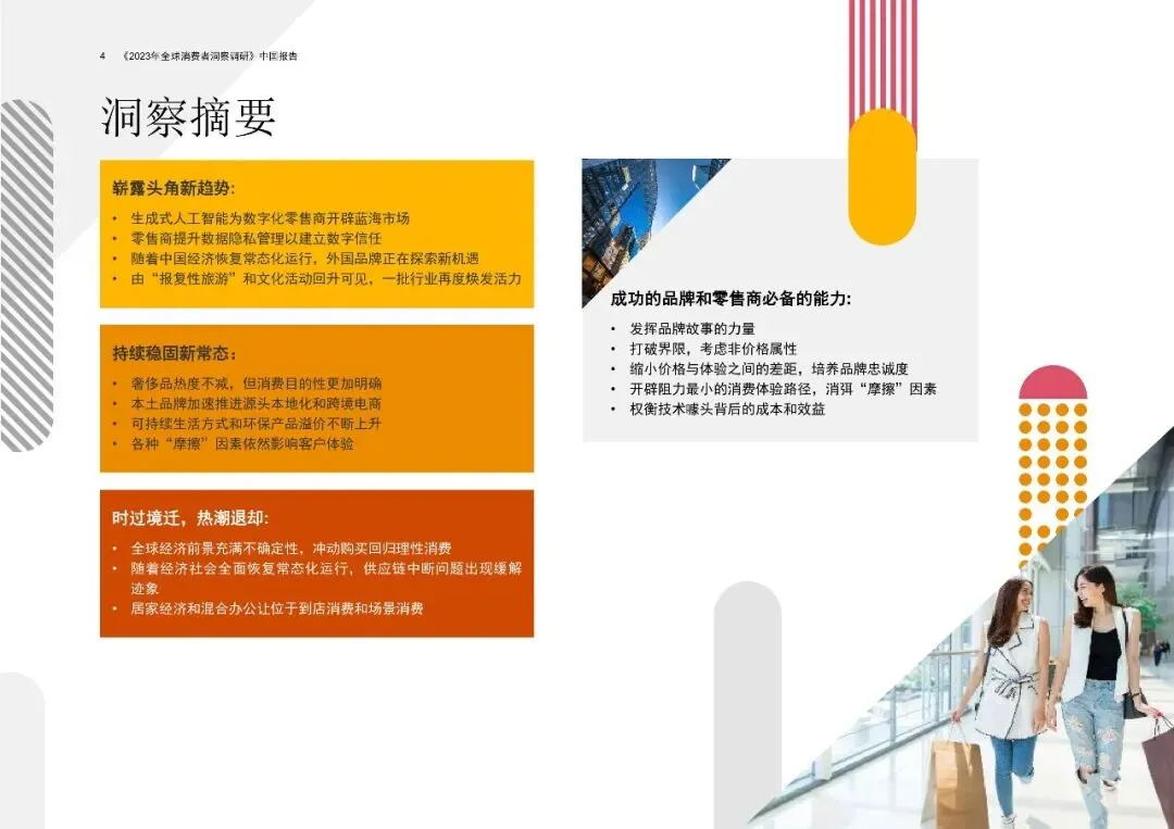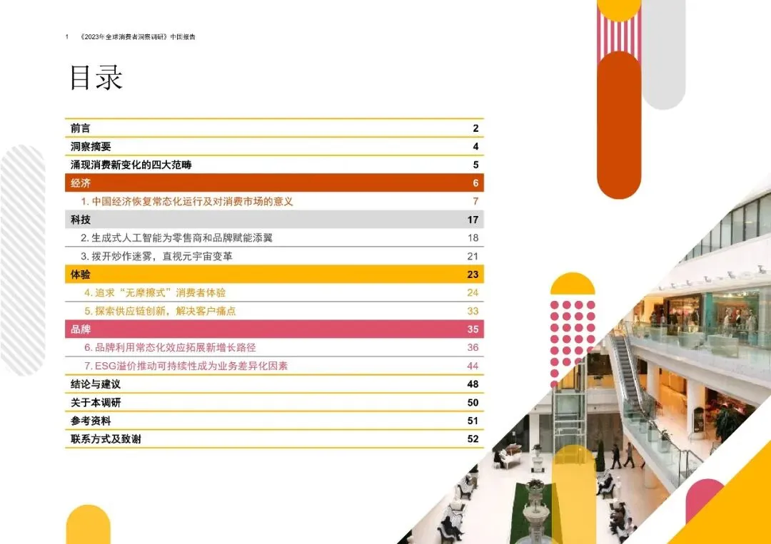 欢迎阅读本报告,了解我们对中国消费市场的概况分析和最新解读,并探索这些洞察如何帮助品牌和零售商应对下一阶段的零售变革浪潮。我们希望这些洞察能够为品牌赋能添翼,协助零售商从容自信地把握机遇,在经济恢复常态化运行背景下完善其品牌策略,并充分利用中国消费复苏的契机,打造可持续增长模式,开辟通往成功的新路径。