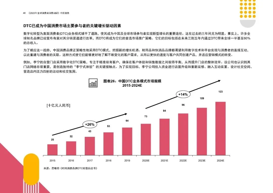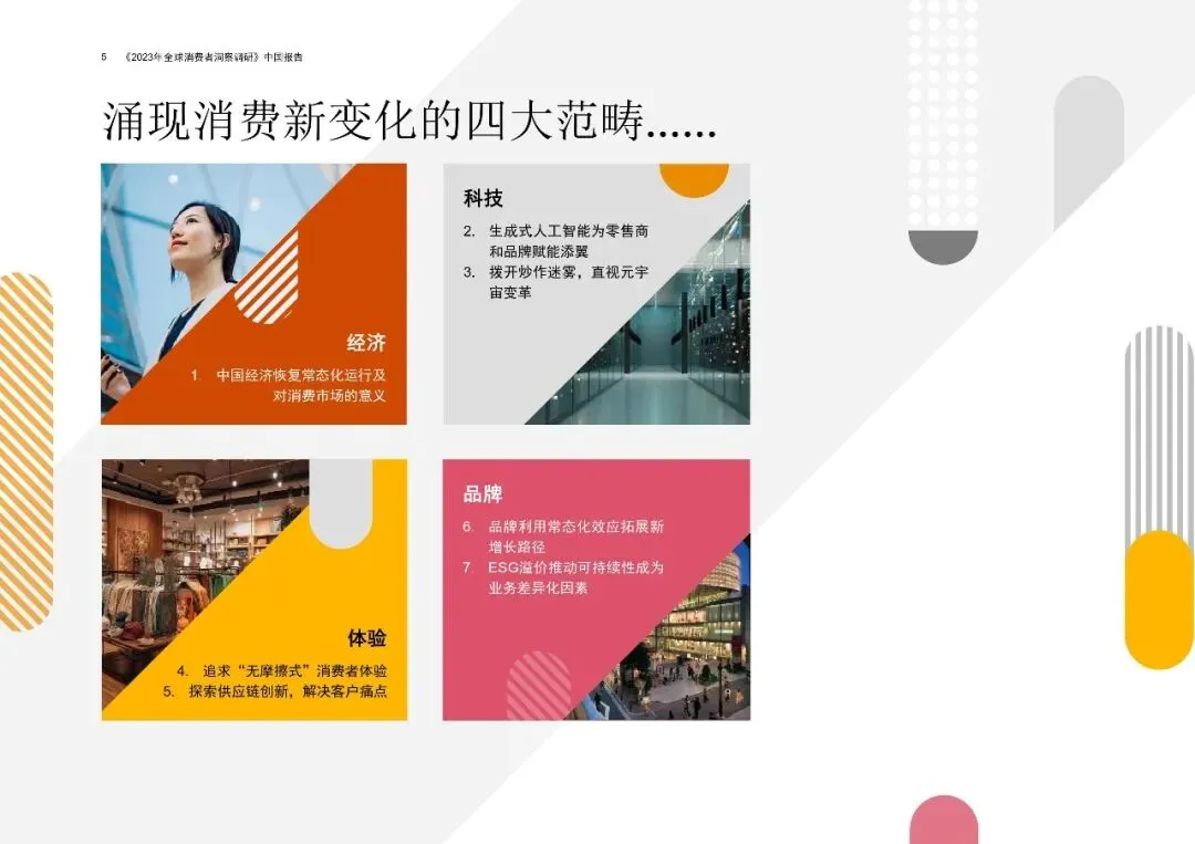 在2023年之前,中国消费者的行为习惯正在不断变化。经济社会复苏、生成式人工智能、报复性旅游、健康和可持续生活方式的变化等因素正在推动中国普通消费者的消费模式加速变革。然而,消费者和品牌面临着内外挑战,包括商业环境波动和客户满意度下降,许多企业认为维持现有模式不足以维持未来十年的生存。