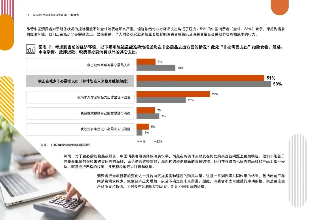 2023年以来,中国消费者继续受到财务不确定性的影响,而就业形势稳中承压也突显了这一点。在此背景下,他们正在削减开支,并重新调整不同品类的消费。大多数参与调研的消费者计划在未来六个月内采取一定的措施来节省开支。