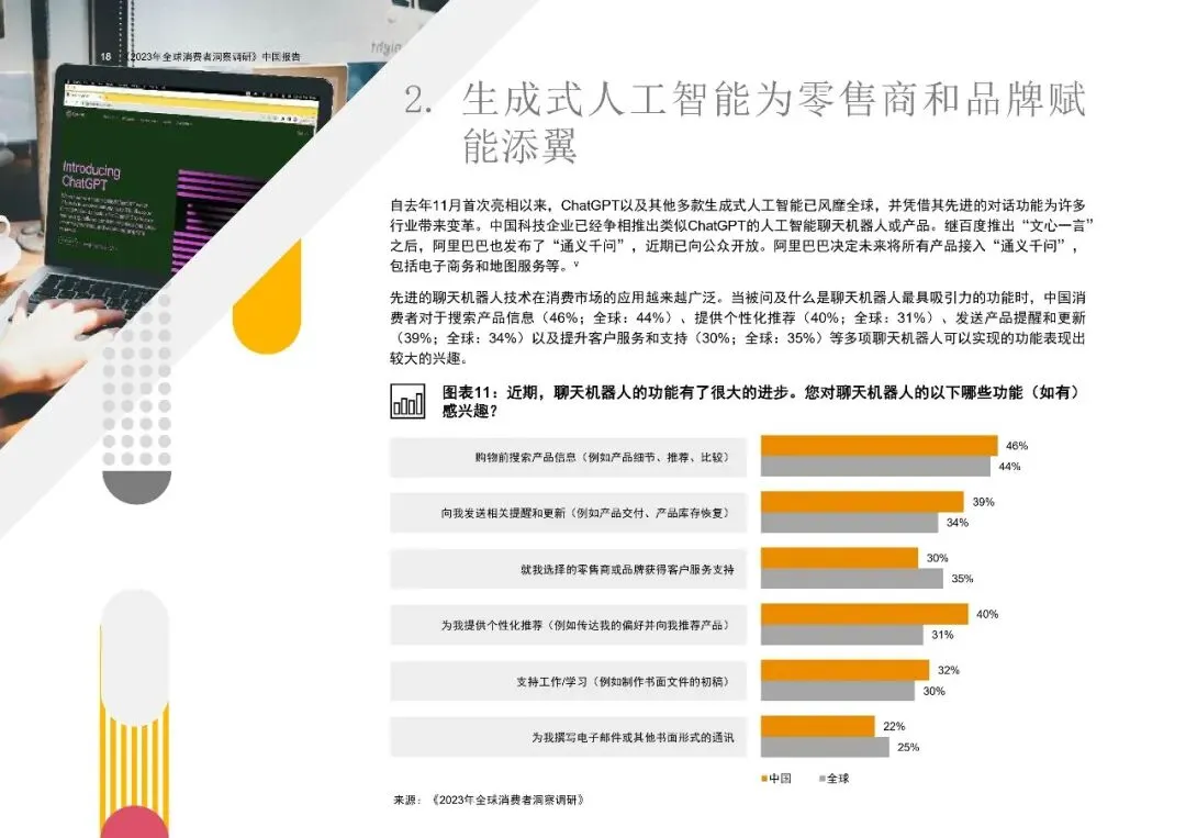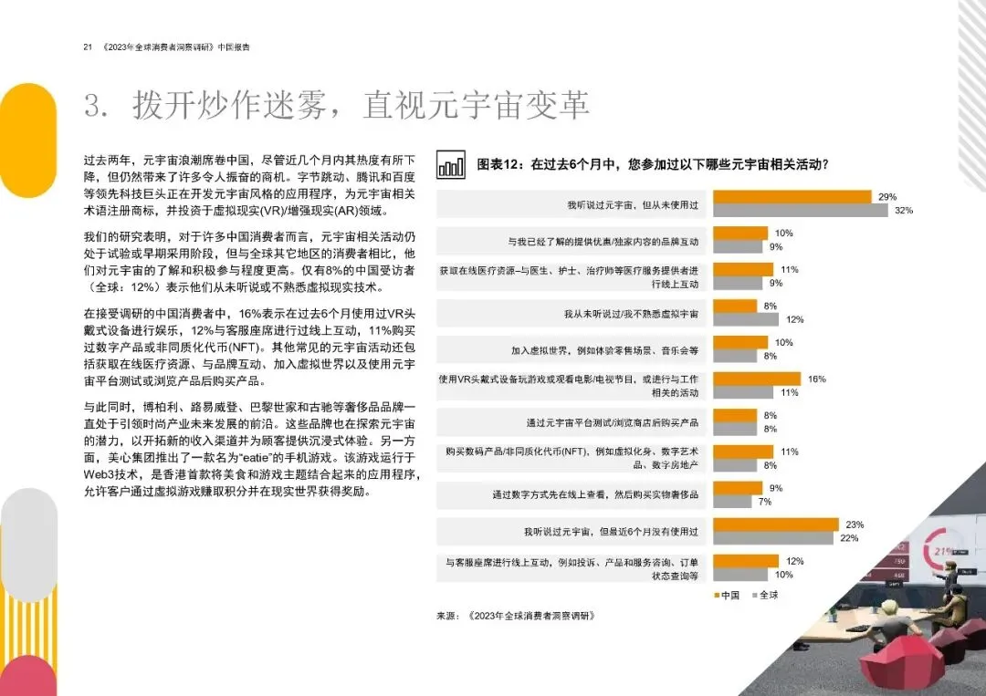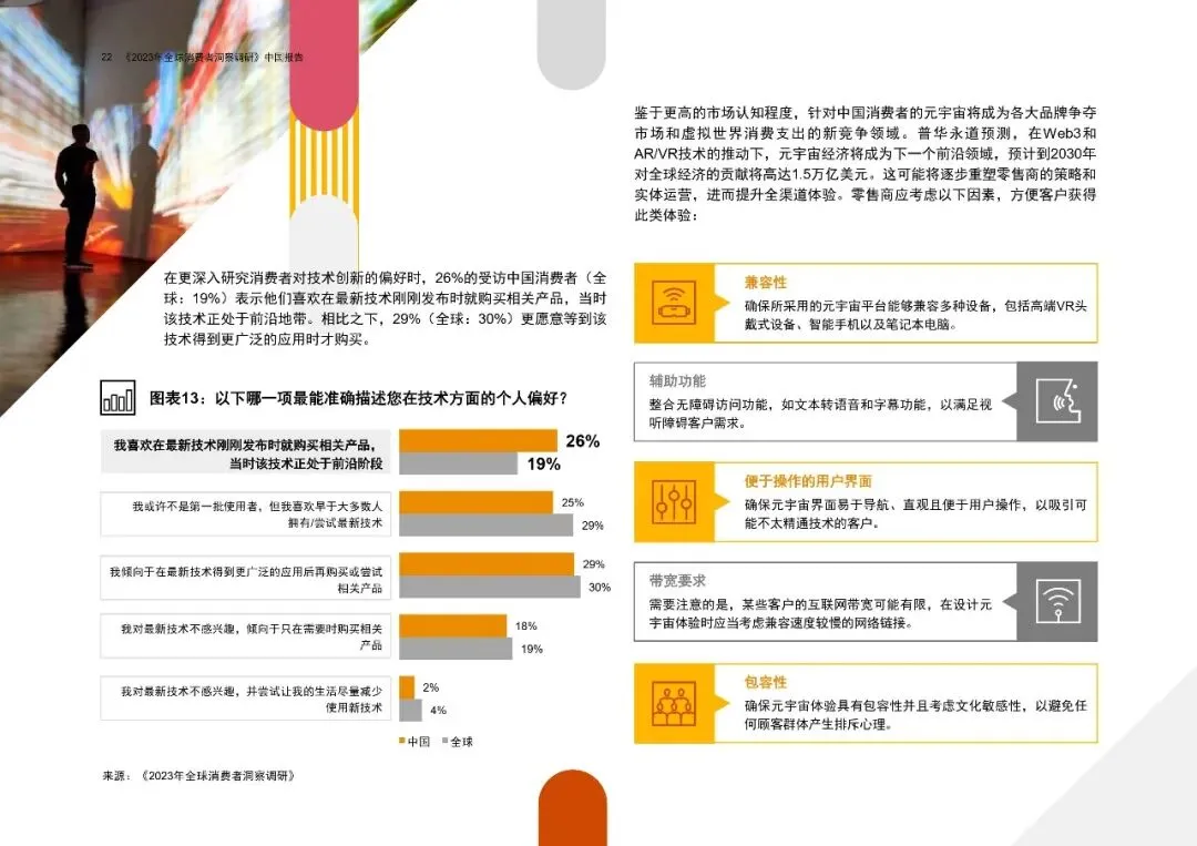 首先,大语言模型的诞生及其在商业中的诸多应用在零售商中引发轰动,彻底改变了他们与客户互动、展示产品和管理运营的方式。我们的调研显示,随着消费者日益追求“无摩擦式”消费体验,他们不再仅仅满足于传统的电子商务和以技术为媒介的实体体验,转而开始探索下一代数字平台,包括生成式人工智能、第三代互联网(Web3)以及不断发展的元宇宙。