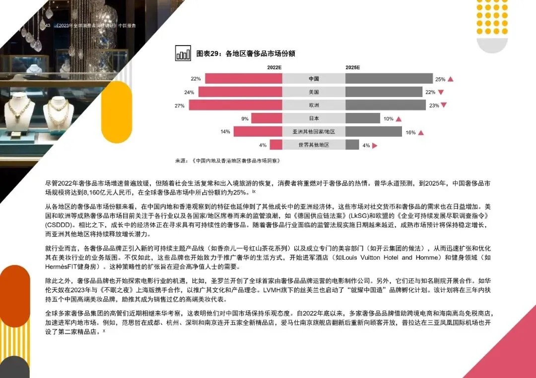 尽管与其他品类相比,中国奢侈品消费的净增长幅度较低,但仍然维持稳定。这归因于越来越多的目标驱动型购物消费,例如通过购买奢侈品获取积极情绪、渴望追逐潮流以及寻求保值或投资手段。虽然消费模式更加趋于谨慎,但可持续生活方式和环保产品的溢价却在不断上升。随着零售商为了减少地缘经济的干扰而寻求缩短供应链周期并扩大供应网络,源头本地化趋势进一步增强。