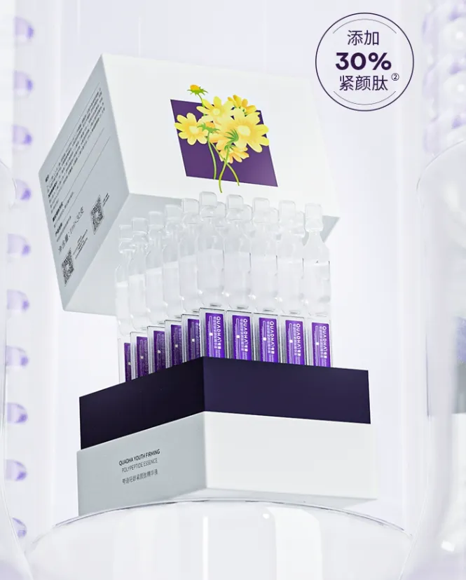 夸迪推出的紧颜肽次抛精华液,以专研5D玻尿酸为基础,针对抗皱紧致的宣称,建立了「抚纹肽」+「胶原肽」+「双抗肽」的核心成分矩阵,具体来看,采用「类蛇毒肽+乙酰基六肽-1」对抗动态纹;「棕榈酰三肽-5+三氟乙酰三肽-2」促生胶原;「脱羧肌肽」抗氧化与抗糖化。