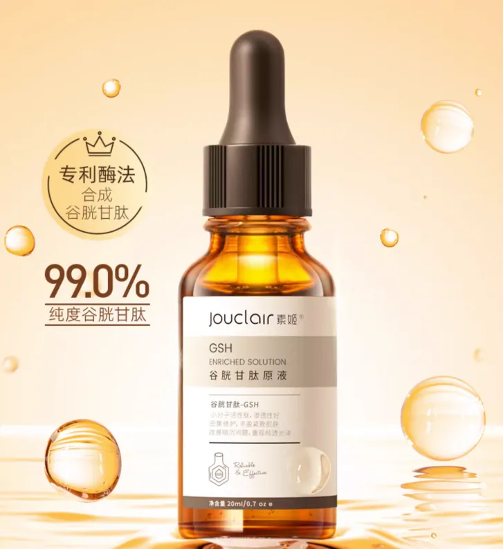 素姬推出的谷胱甘肽原液,主张四重链路、多维度提亮肤色,核心成分为高纯度谷胱甘肽抗自由基,同时复配烟酰胺和肌肽协同抗糖,并以透明质酸保湿。