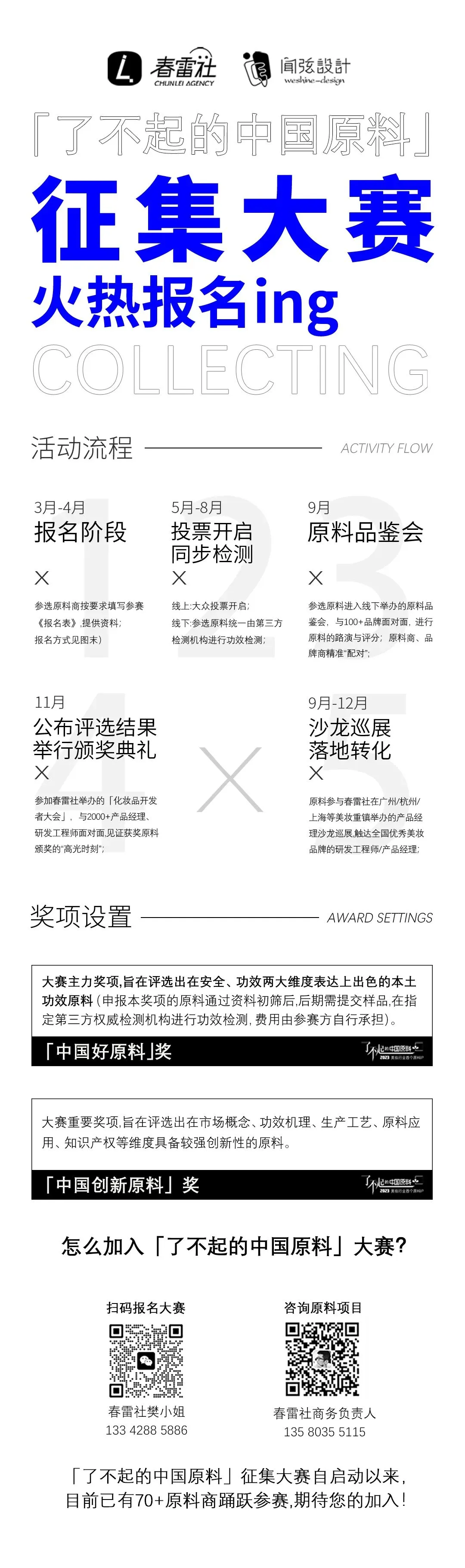 「了不起的中国原料」大赛火热申报中!目前已有70+原料商踊跃参赛,具体活动流程和报名方式见下图: