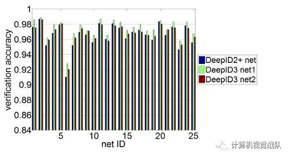 在训练样本上,DeepID3仍采用原来DeepID2+中使用的样本,在25个image patches产生的网络上作对比时,DeepID3 net1优势最为明显,而DeepID3 net2提升不大显著。