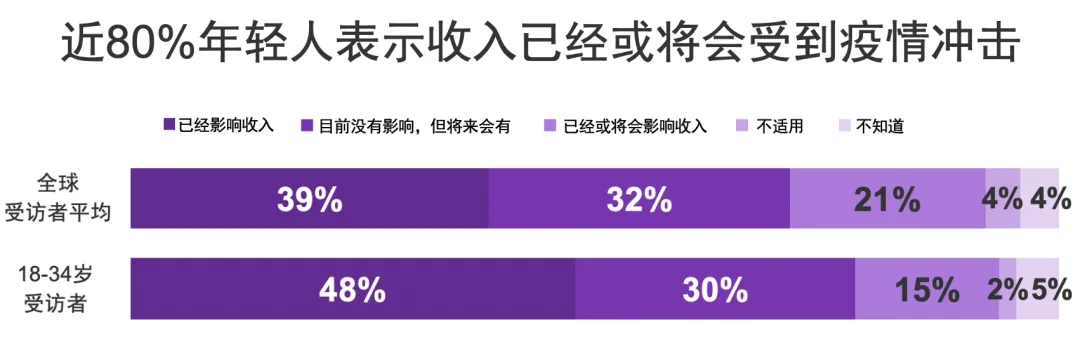 凯度全球新冠疫情消费者追踪报告是全球以新冠疫情为主题的规模最大的消费者调查,覆盖全球50个市场的超过4.5万名消费者。3月底收集的第二波数据显示,与3月中相比,人们对经济的担心已经成为了最主要的忧虑来源。而其中,年轻消费者成为了最弱势的群体。他们对于收入的担心最大,最担心会丢掉工作。总体来说,全球所有受访者中有71%的人表示家庭收入已经或是将会受到疫情的影响,而这一比例在18-34岁的年轻人群中高达近80%(48%已经受到影响,30%将会受到影响)这主要是因为年轻人所从事的工作多为初级职位,或是兼职、临时工,被裁员或失去收入的可能性较大。