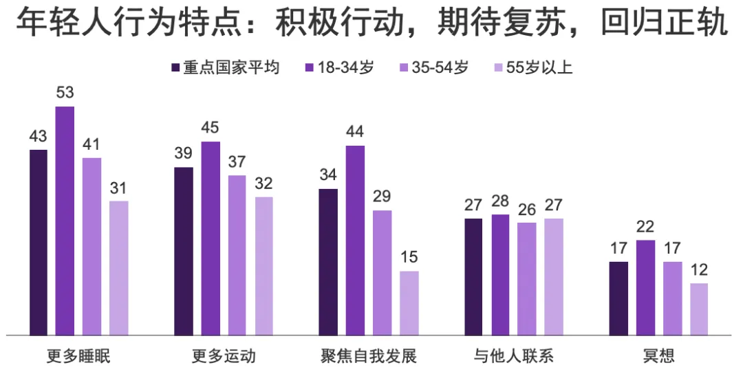 居家隔离改变了所有人的行为模式与生活重心,年轻人也不例外。与其他年龄段的人相比,年轻人们除了成功地补了很多觉之外,他们也在采取积极的行动以充实自己,期待疫情过后能抓住重新出现的机会,让生活回归正轨。年轻人显著高于其他人群的行为包括“更多运动”(45%)、“聚焦自我发展”(44%)、“冥想”(22%)等。