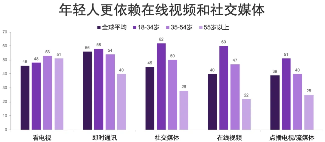 当大家都被要求居家隔离之后,所有人群的媒体使用时长都有所上升。但作为“网络原住民”的年轻人群对数字媒体和社交媒体的使用上升更为明显。与其他年龄段的受访者相比,表示对在线视频类的媒体使用增加的年轻人比例更高,包括网络视频和点播电视/流媒体;表示使用社交媒体时间增长的年轻人比例也高于其他年龄段。但是表示对传统电视收看增加的年轻人比例却低于其他年龄段。