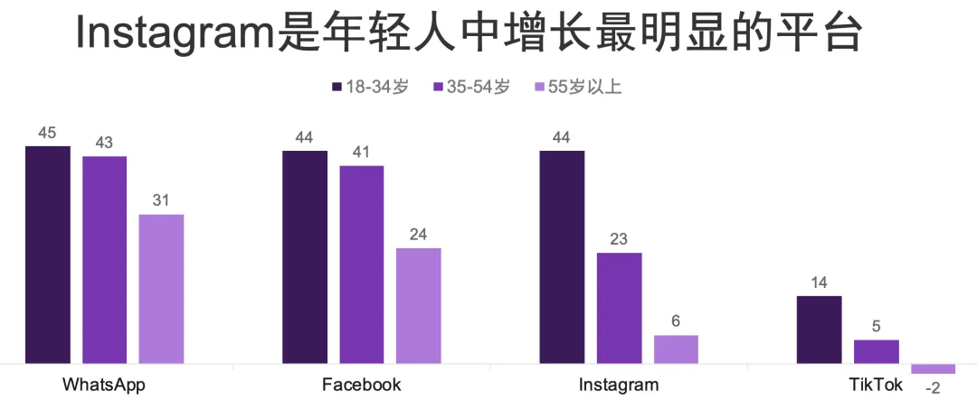 如果仔细分析各社交媒体平台的话,Instagram的增长在年轻人群中更为明显,相比之下抖音的海外版TikTok虽然也有增长,但相对很小,而且是唯一在55岁以上人群中出现下降的社交媒体。