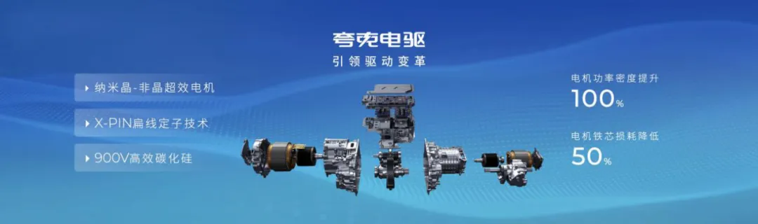 首先是夸克电驱的推出,实现12kW/kg的功率密度,相比行业提高一倍,体积却仅为主流产品的二分之一,同时还兼顾强劲动力,被称为“掌上V8”,一举推动了电驱技术变革。