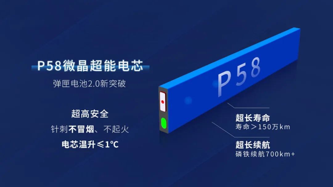 因湃电池工厂投产,将弹匣电池2.0系列产品正式量产,其中最核心的技术亮点集中体现在P58微晶超能电芯上,并具备超高安全性、高能量密度、长寿命及优异快充性能等特点。