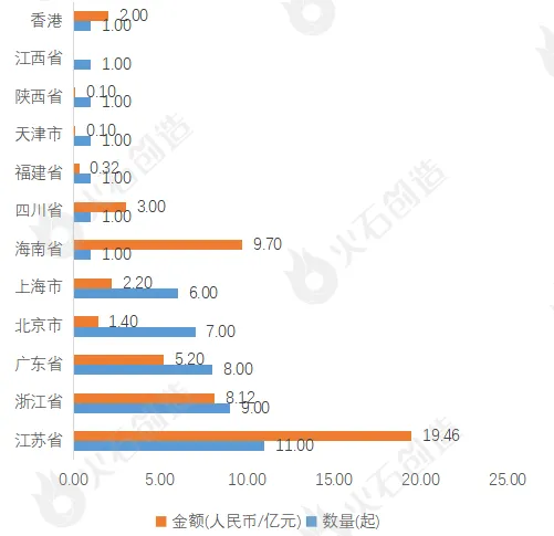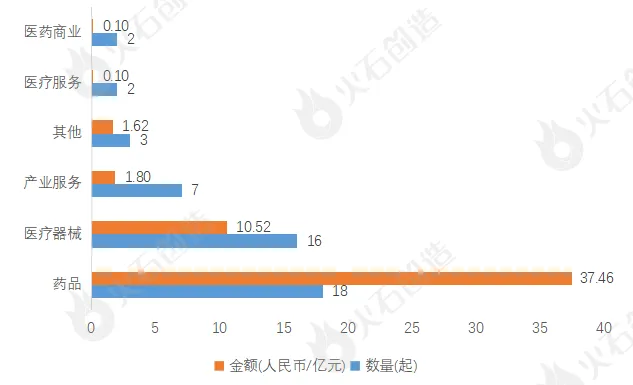 【最受投资人欢迎的领域】本月药品领域最为吸金,融资金额高达37.46亿元,占总融资金额的72.60%。从项目数量上看,医疗器械领域也较为活跃。