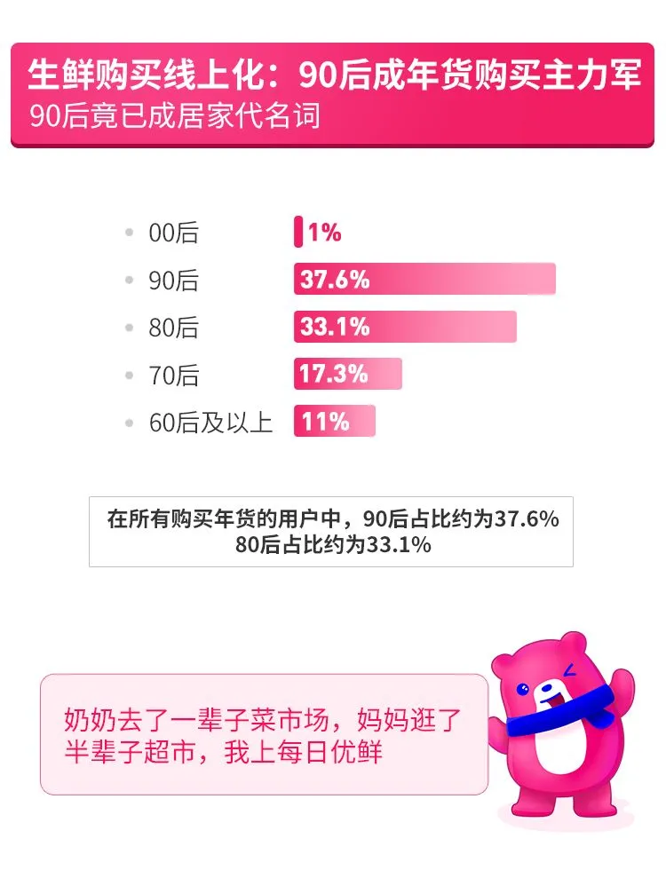 事实上,90后成为生鲜年货消费占比最高的群体并无意外。90后是与互联网共同成长的一代,对互联网电商渠道有着天生的亲近感。随着90后步入婚姻生活,购买生鲜成为刚需,他们不再如父辈选择线下超市、菜市场作为生鲜年货购买地,而是选择精选品类、即时送达的生鲜电商作为年货购买渠道。