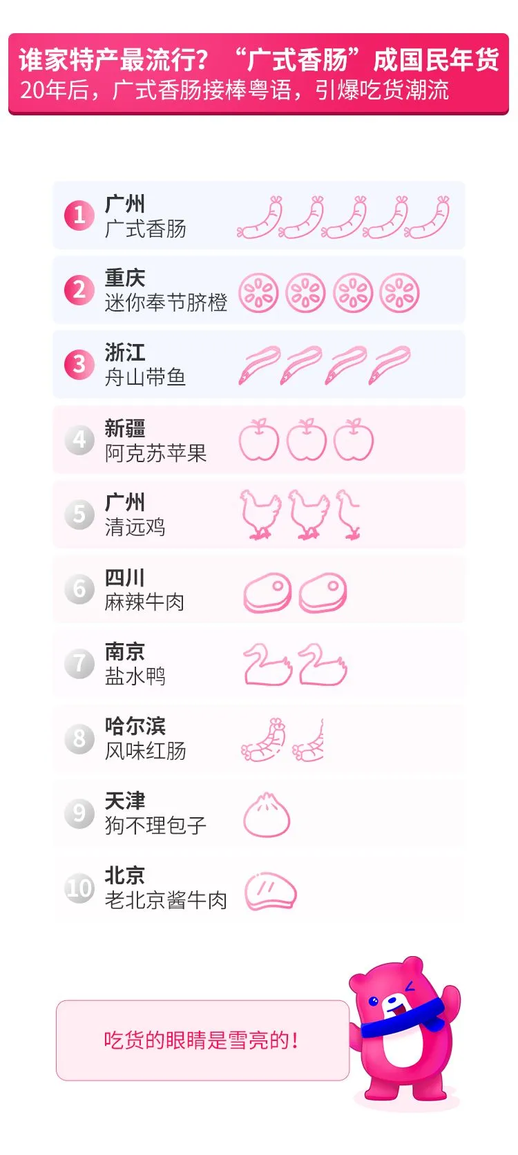 数据显示,在所有地方的特产中,广式香肠凭借销量冠军成为当之无愧的“国民年货”。此外,重庆奉节脐橙、浙江舟山带鱼、新疆阿克苏苹果、广州清远鸡紧跟其后。值得注意的是,在最受全国用户喜爱的十大地产特产年货中,来自南方的六款特产榜上有名。北方区域特产来看,哈尔滨风味红肠、天津狗不理包子、北京的酱牛肉亦受到全国用户喜爱。
