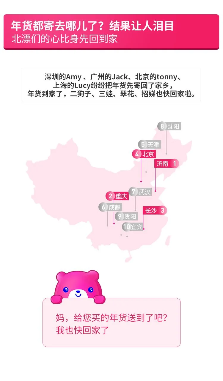 年货比人先到家已经成为很多“漂”们的新选择。在外辛苦工作一年的“漂们”,思乡情绪在春节前集中爆发,他们大多数会选择提前为远方的亲人挑选年货,把爱和牵挂邮寄回家。数据显示,超过9成外地工作的用户会线上购买年货礼盒寄回家乡,其中济南、长沙、重庆成为收到年货礼盒最多的城市。