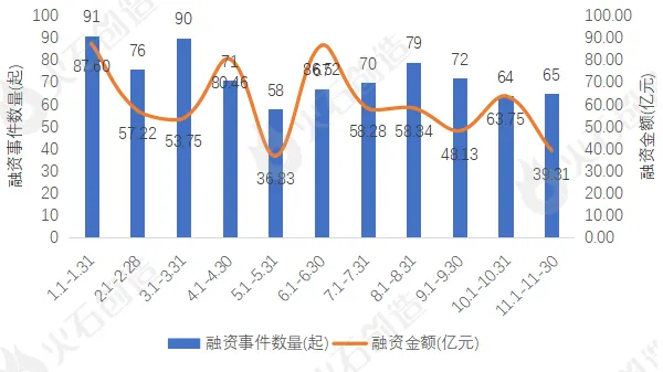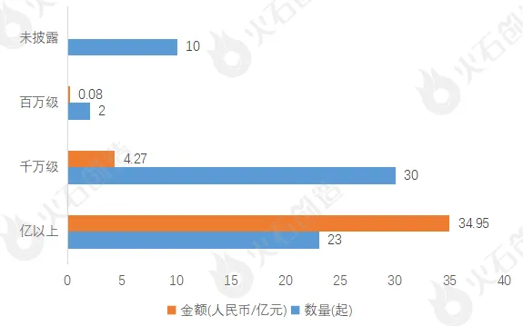【融资金额分布】本月共65个项目获得投资,累计金额超39.31亿元,单笔融资金额超过亿元的案例23起,合计融资金额高达34.95亿元,占本月融资规模总额的88.92%。来源:火石创造产业数据中心
