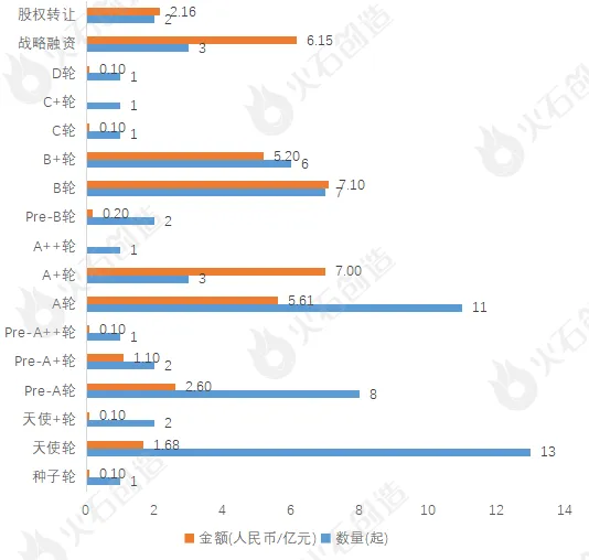 【融资轮次分布】从融资轮次上看,本月融资事件大多集中在天使轮到A轮,共有37个项目获投。从融资金额来看,B轮融资获得最高融资金额7.10亿元,占总体融资金额的18.06%;其次,A+轮也获得了较高融资金额7.00亿元,占总体融资金额的17.81%。来源:火石创造产业数据中心