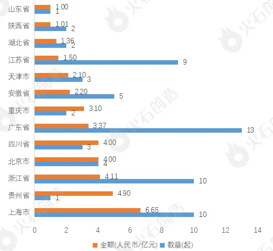 【融资地域分布】本月融资项目主要分布在广东省(13起)和上海市(10起)及浙江省(10起)。从融资金额来看,上海市最为突出,融资金额高达6.65亿元,占总融资金额的16.92%;其次,贵州省也较为突出,融资金额高达4.90亿元,占总融资金额的12.47%。