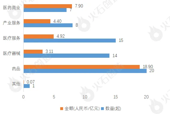 【最受投资人欢迎的领域】本月药品领域最为吸金,融资金额高达18.90亿元,占总融资金额的48.09%。从项目数量上看,医疗服务领域也较为活跃。