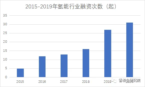 根据香橙会氢能数据库统计,氢燃料电池行业自2015年以来,共发生融资事件104起,分别为:2015年5起,2016年12起,2017年13起,2018年16起,2019年27起,2020年31起,行业融资案例持续增加。