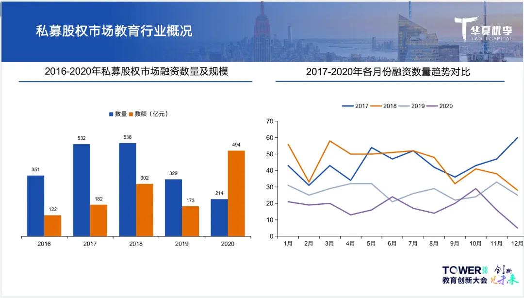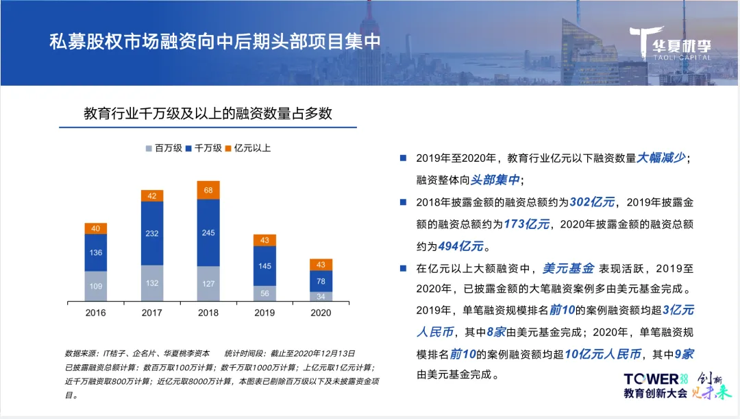 这张图绘制了从2016年至2020年,整个私募融资市场在教育细分赛道上的融资数量和规模情况,蓝色是数量,红色是数额。可以明确的看到,从2016年到2020年这几年下来,教育市场上的私募融资数量呈现出一个逐年降低的趋势。但是却有很突兀的一个橘色柱状在2020年凸起,它的金额超出了前四年每一年的私募融资金额。