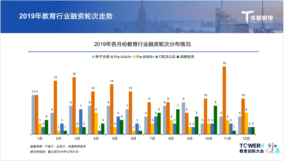 桔红色代表的是PreA/A/A+轮的融资,这说明在2019年的时候,PreA/A/A+轮的融资的项目是相对早期的项目,没有到天使轮这么早,但是已经有了一些数据,跑通了一些商业模式,只是从整体来说可能体量没有很大。