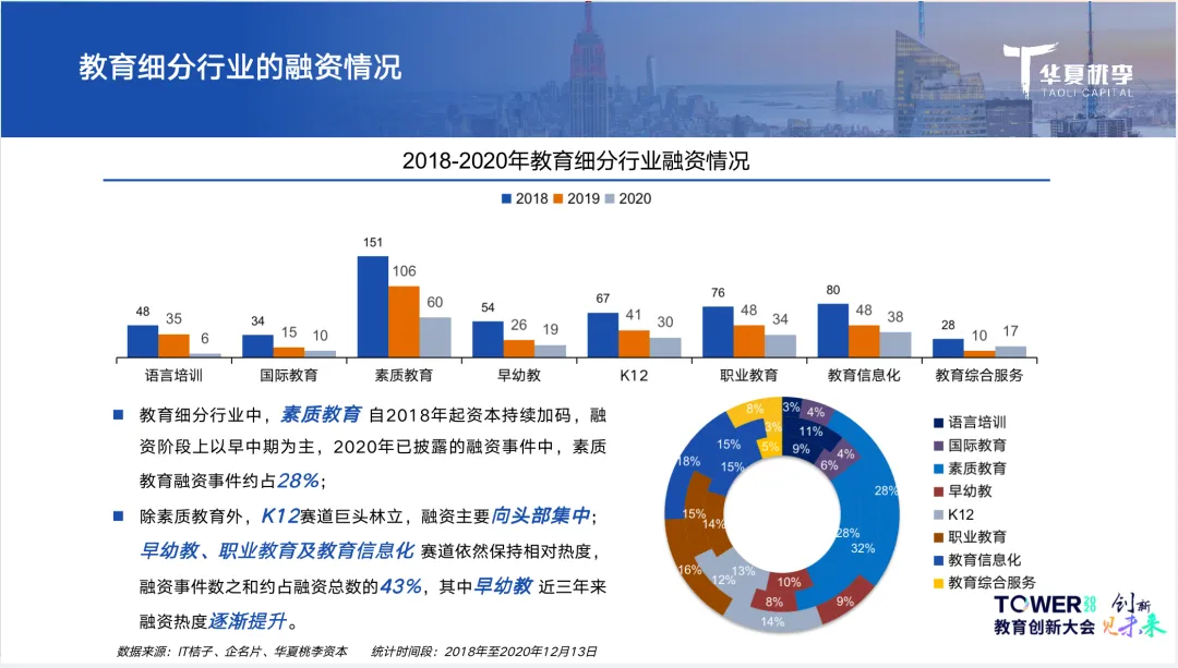 但是依然可以看到在2020年,素质教育、K12、职业教育、教育信息化这几个大的赛道还是完成了一定量的融资,相对来说更加受到了资本的追捧。