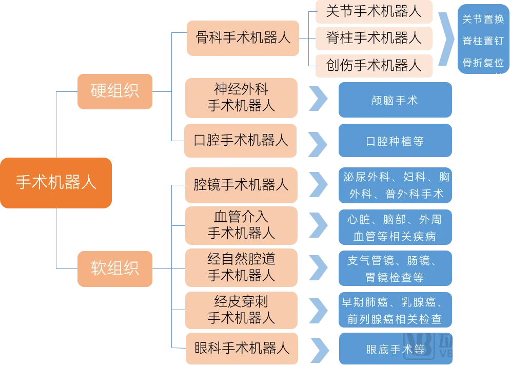 手术机器人是集临床医学、生物力学、机械学、计算机科学、微电子学等诸多学科为一体的新型医疗器械,通过清晰的成像系统和灵活的机械臂,以微创的手术形式,协助医生实施复杂的外科手术,完成术中定位、切断、穿刺、止血、缝合等操作。按照手术目标脏器类型,手术机器人可分为硬组织机器人和软组织机器人。