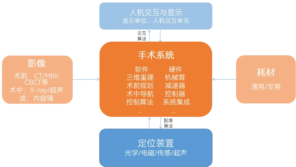 手术机器人具有多学科融合、技术壁垒高的特点。整体来看,手术机器人的功能模块分布如下: