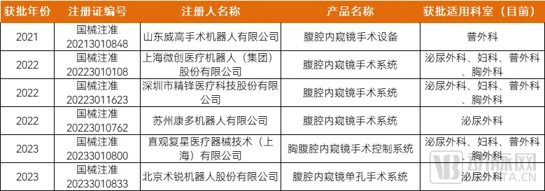 目前国内获NMPA批准(境内)的腔镜手术机器人共6家,整体获批在数量上实现逐年突破。
