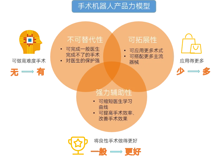 在应用上,产品力即手术机器人实现核心价值是根本。我们认为,手术机器人的产品力主要包括三个方面:不可替代性、强力辅助性、可拓展性。