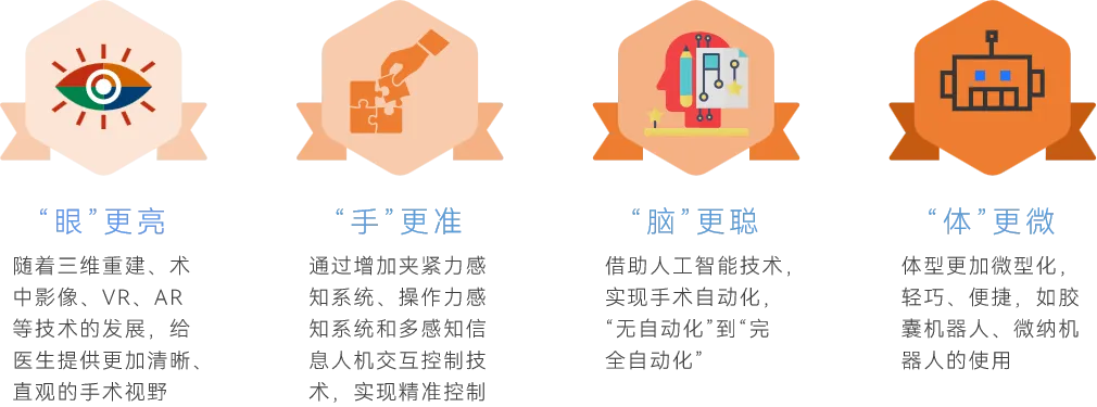 从更长远来看,微型化是手术机器人的另一个发展趋势,先是“体型”更轻巧、使用更便捷,再到胶囊机器人、微纳机器人的发展,进一步推动手术无创化,实现“体”更微。