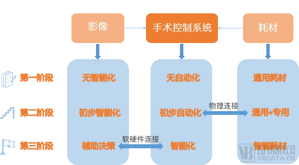 目前这个阶段更多是操作类复现,影像没有实现智能化,耗材也是通用耗材;第二阶段,影像引导定位,初步实现智能化,耗材有通用和专用,而耗材和手术系统的连接是物理连接;到第三个阶段,图像更加智能化,和手术系统可实现软硬件连接,并且有智能耗材应用,如传感器、芯片等,当然,这个过程可能比较久远。
