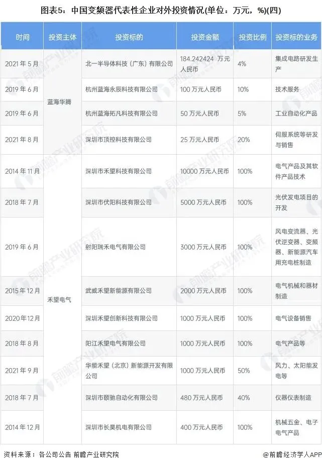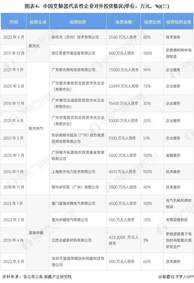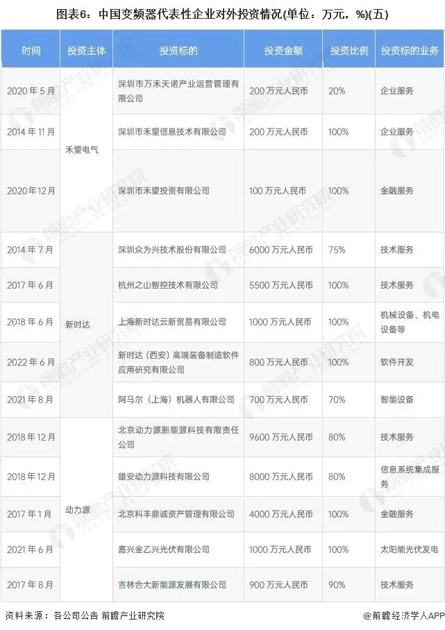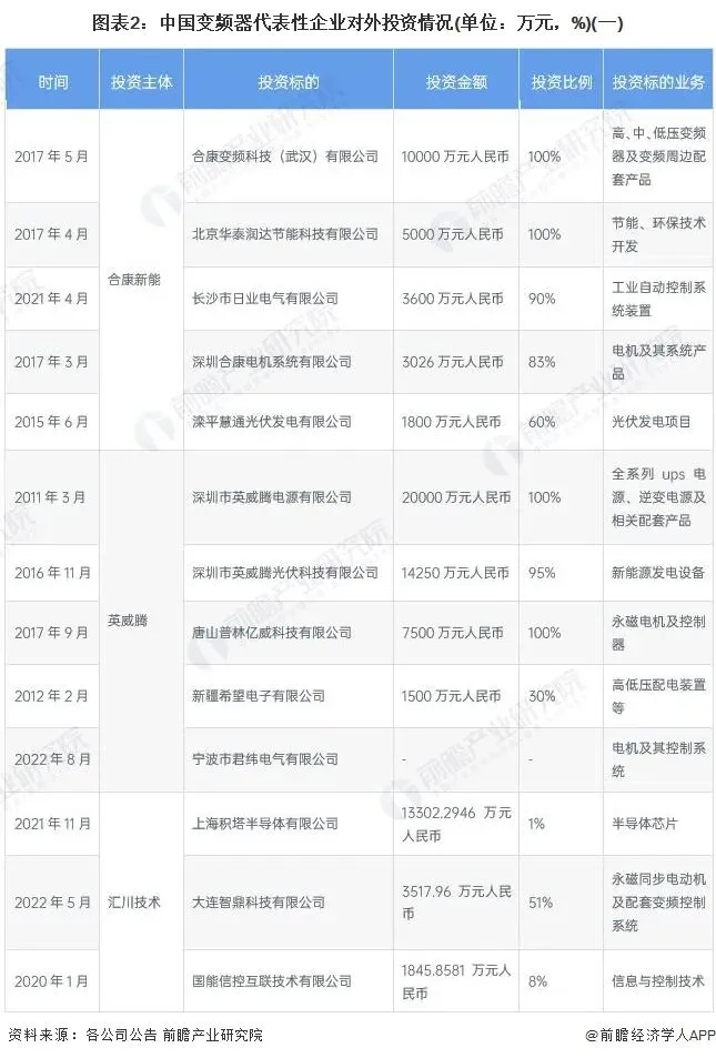 从中国代表性企业的对外投资来看,合康新能、英威腾、汇川技术、新风光、智光电气、蓝海华腾、禾望电气、新时达、动力源、伟创电气、正弦电气等企业通过对外投资来完善相关技术、实现产能的扩充,以及多样化业务。