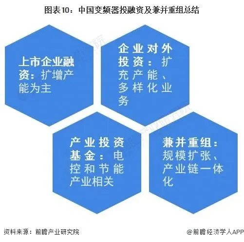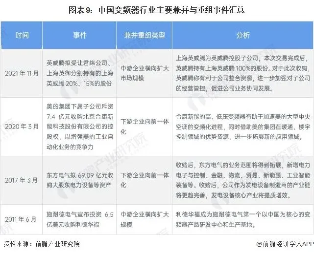 根据分析,变频器行业的兼并重组驱动因素主要包括扩大市场规模和促进产业链一体化等。比如英威腾收购上海英威腾,有利于公司整合资源;美的集团收购合康新能助于加速美的大型中央空调的变频化进程;施耐德电气公司收购利德华福意为打入中国市场以提升市场份额;东方电气收购东方日立意为完善变频器领域业务等。