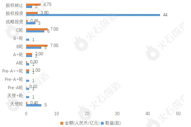 【融资轮次分布】从融资轮次上看,本月融资事件大多集中在股权投资,有44个项目获投。从融资金额来看,B轮及C轮融资都获得最高融资金额7.00亿元,各占总体融资金额的26.11%;其次,股权转让融资也获得了较高的融资金额 4.75亿元,占总体融资金额的17.72%。