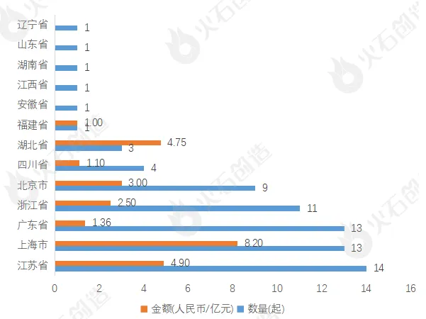 【融资地域分布】本月融资项目主要分布在江苏省(14起)和上海市(13起)及广东省(13起)。从融资金额来看,上海市最为突出,融资金额高达8.20亿元,占总融资金额的30.59%;其次,江苏省也较为突出,融资金额高达4.90亿元,占总融资金额的18.28%。