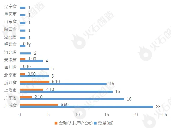 【融资地域分布】本月融资项目主要分布在江苏省和广东省,分别有23个和18个项目获投。从融资金额来看,江苏省最为突出,融资金额高达6.60 亿元,占总融资金额的33.00%;其次,浙江省也较为突出,融资金额达5.10亿元,占总融资金额的25.50%。