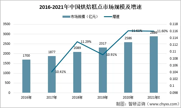 现代烘焙食品行业在我国内地起步较晚,随着我国人均消费水平的增长、餐饮消费结构的调整以及生活节奏的变化,具备营养健康、快捷多样等优点的烘焙食品在我国步入了快速增长的时期。从消费层面上看,烘焙零售市场增长迅速,2020年中国烘焙糕点市场规模为2586亿元,同比2019年增长11.61%;烘焙食品市场将有望保持10%以上的增长率,预计2021年中国烘焙糕点市场规模达2886亿元,烘焙食品行业进入高速发展时期。