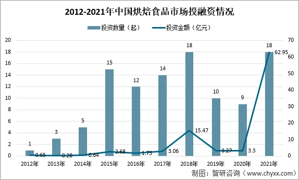 2021年,中国烘焙食品行业投资数量18起,较2020年增加了9起,同比增长100%。2021年中国烘焙食品行业投资金额为62.95亿元,较2020年增加了59.65亿元,增长了近18倍,投资金额达近十年最高。