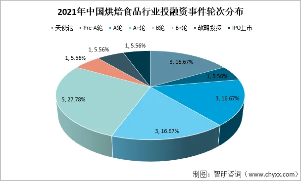 2021年,中国烘焙食品行业投融资次数共18起,其中天使轮3次,占比16.67%;Pre-A轮1次,占比5.56%;A轮3次,占比16.67%;A+轮3次,占比16.67%;B轮5次,占比27.78%;B+轮1次,占比5.56%;战略投资1次,占比5.56%;IPO上市1次,占比5.56%。