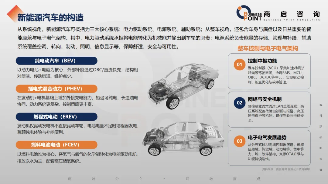 从系统视角,新能源汽车可概括为三大核心系统:电力驱动系统、电源系统、辅助系统;从整车视角,还包含车身与底盘以及日益重要的智能座舱与电子电气架构。其中,电力驱动系统承担将电能转化为机械能并输出到车轮的职责;电源系统负责能量的存储、管理与补给;辅助系统覆盖空调、转向、制动、照明、信息显示等,保障舒适、安全与可用性。