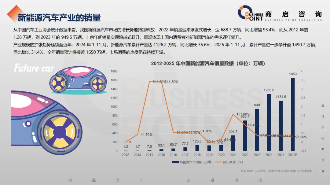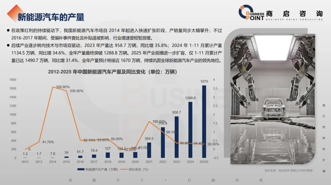 产业规模的扩张趋势延续至近年:2024 年 1-11 月,新能源汽车累计产量达 1126.2 万辆、同比增长 35.6%;2025 年 1-11 月,累计产量进一步攀升至 1490.7 万辆、同比增长 31.4%,全年销量预计将接近 1650 万辆,市场消费的热度仍在持续升温。