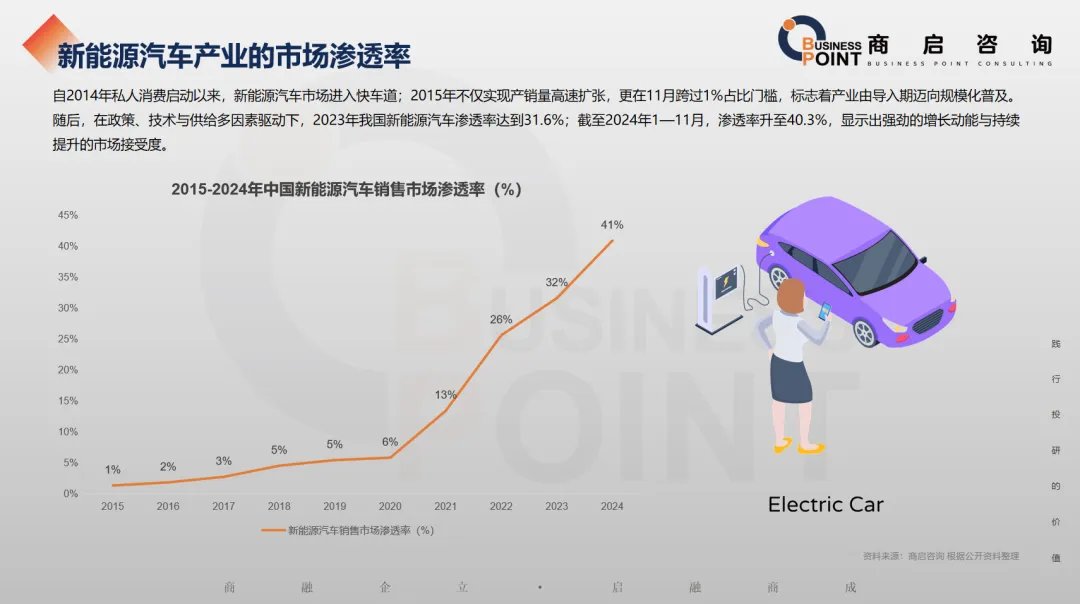 自2014年私人消费启动以来,新能源汽车市场进入快车道;2015年不仅实现产销量高速扩张,更在11月跨过1%占比门槛,标志着产业由导入期迈向规模化普及。随后,在政策、技术与供给多因素驱动下,2023年我国新能源汽车渗透率达到31.6%;截至2024年1—11月,渗透率升至40.3%,显示出强劲的增长动能与持续提升的市场接受度。